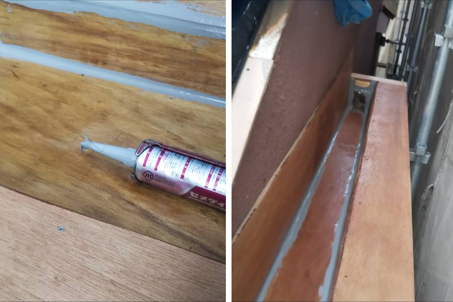 施工内容・既存雨樋の撤去および処分・MFシルキーによる防水下地の施工・木下地の新設・FRP防水工事による仕上げ